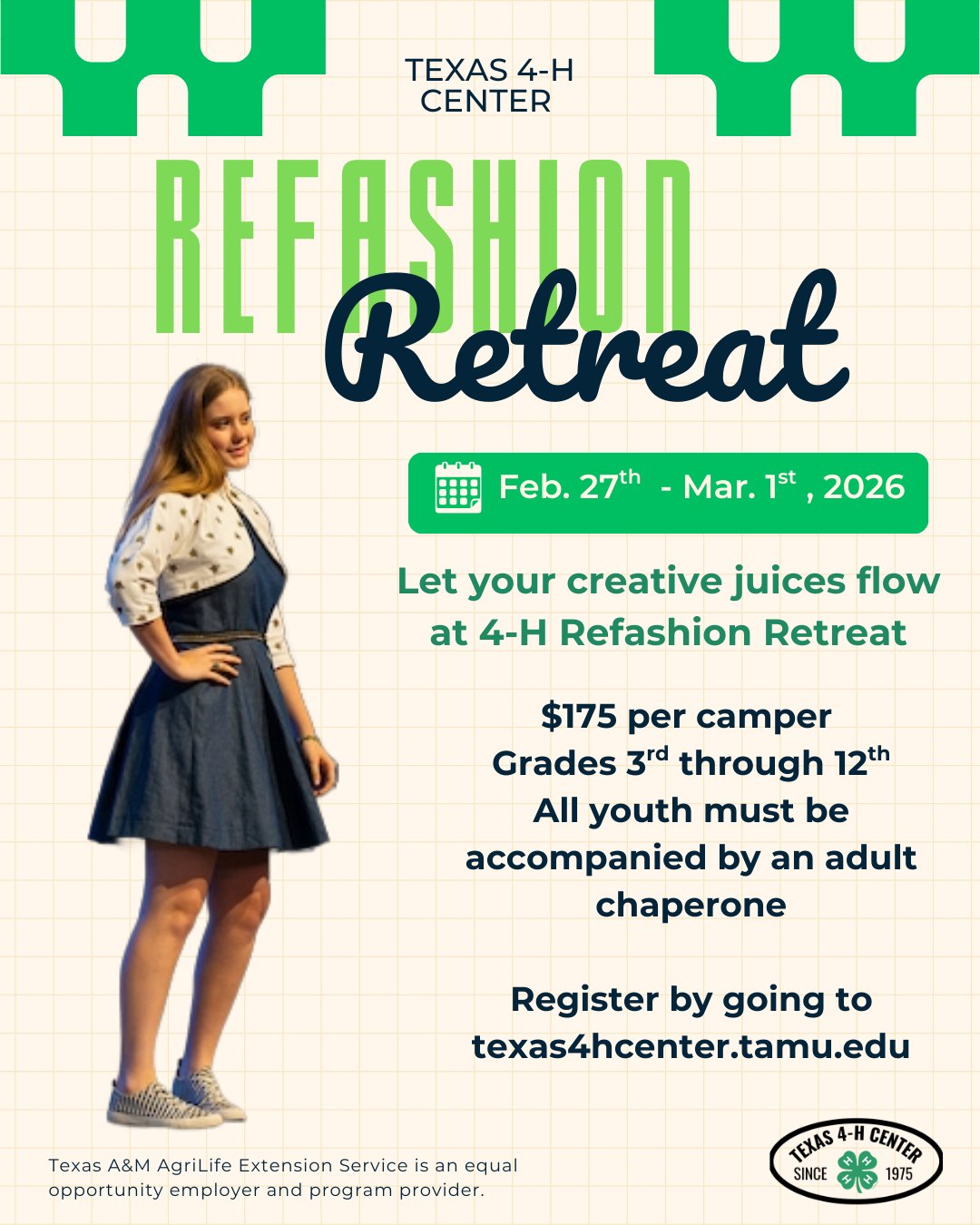 Join us at the end of February for Refashion Retreat—where creativity meets sustainability! Dive into hands-on fashion fun as you transform old pieces into something new, learn design skills, and express your personal style alongside others. Register now and get ready to refashion your way into an unforgettable weekend!